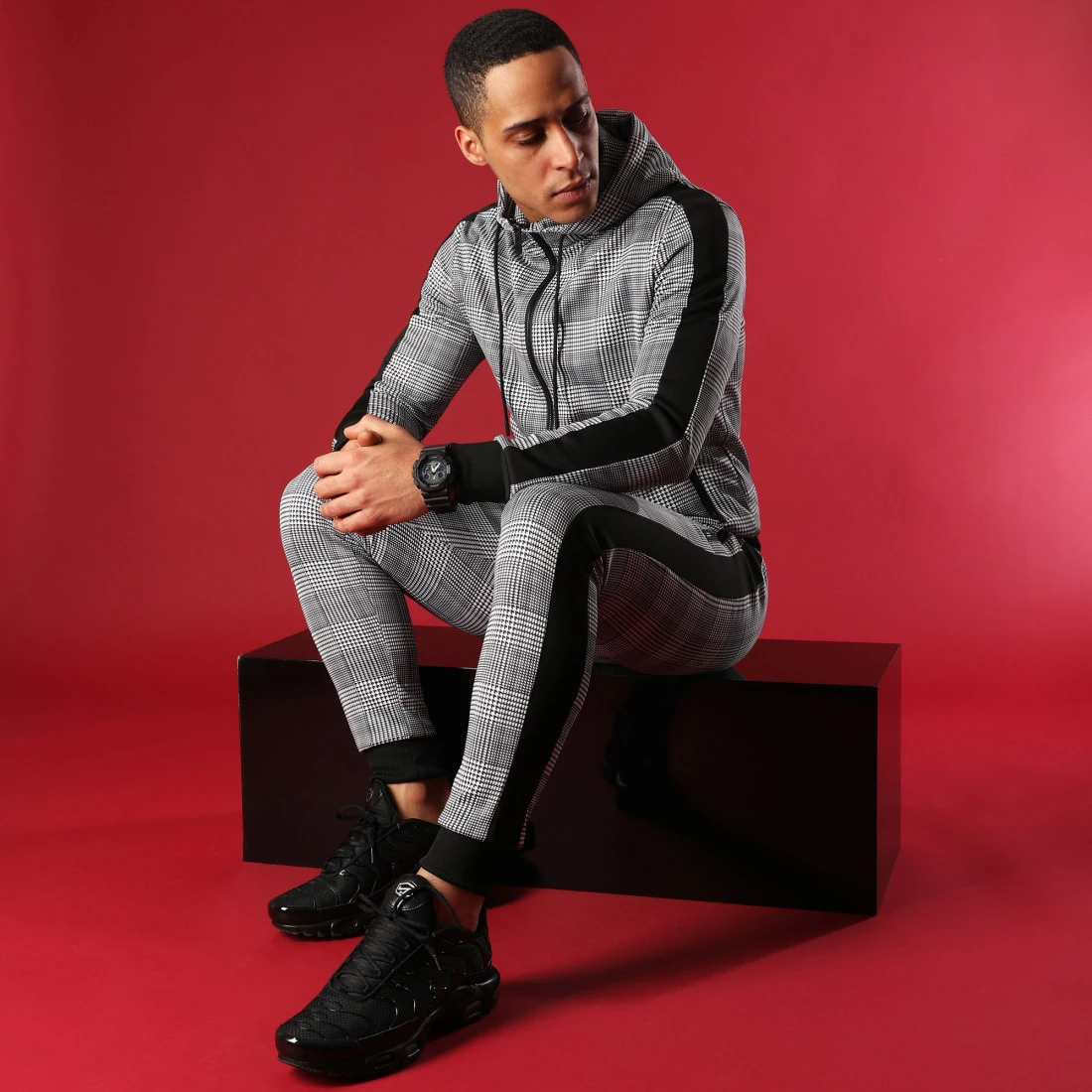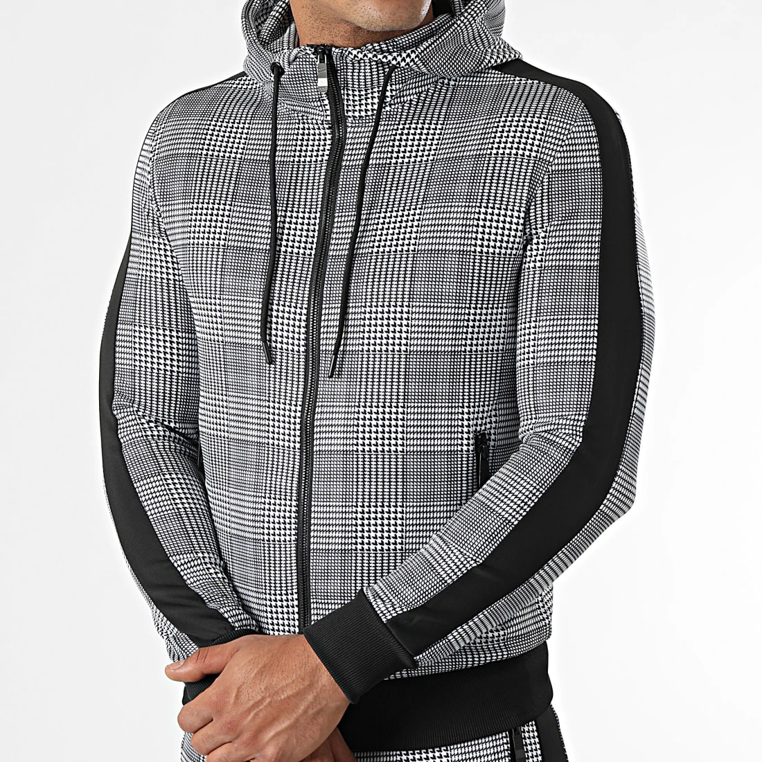 • Motif à carreaux dégradé sur l’ensemble du sweat
