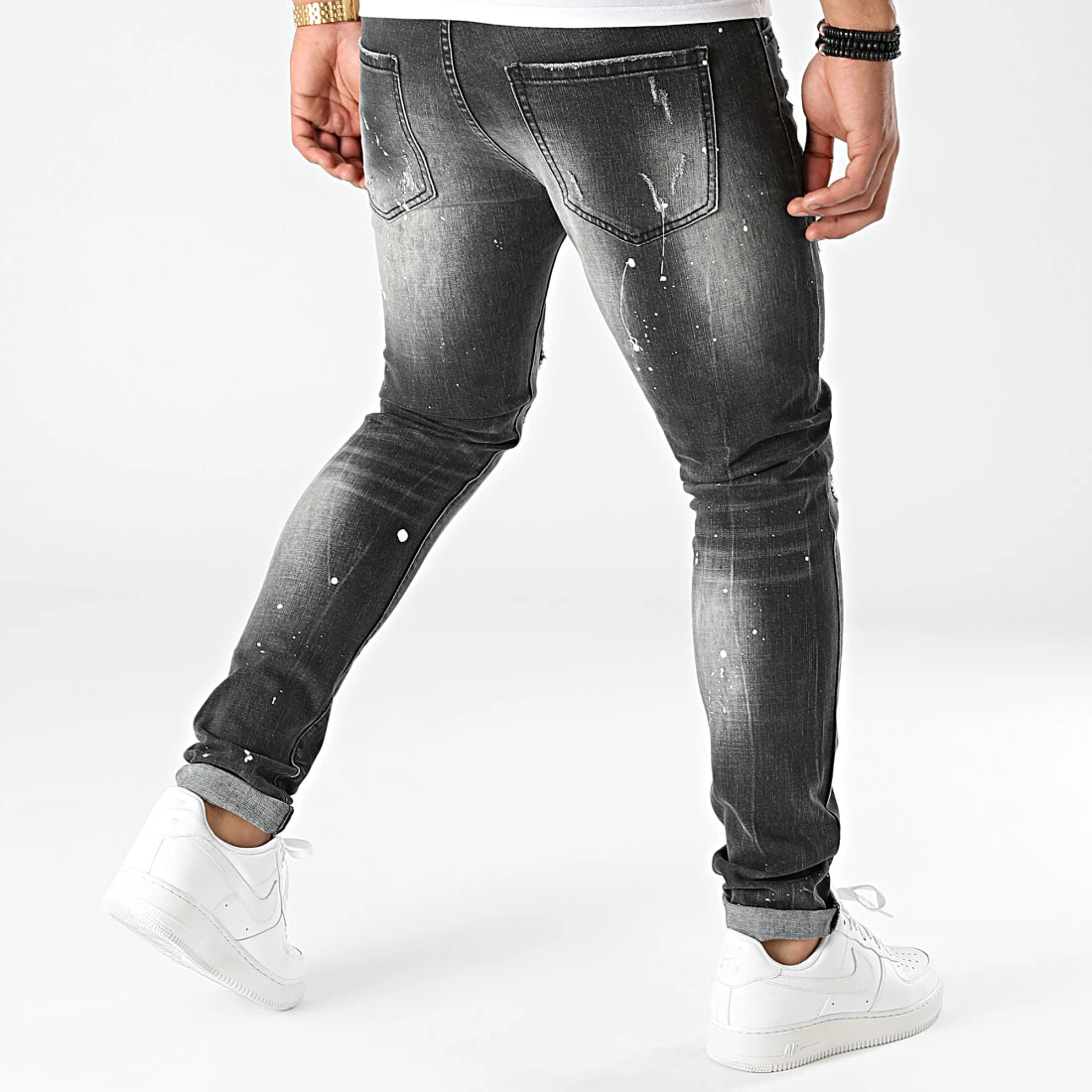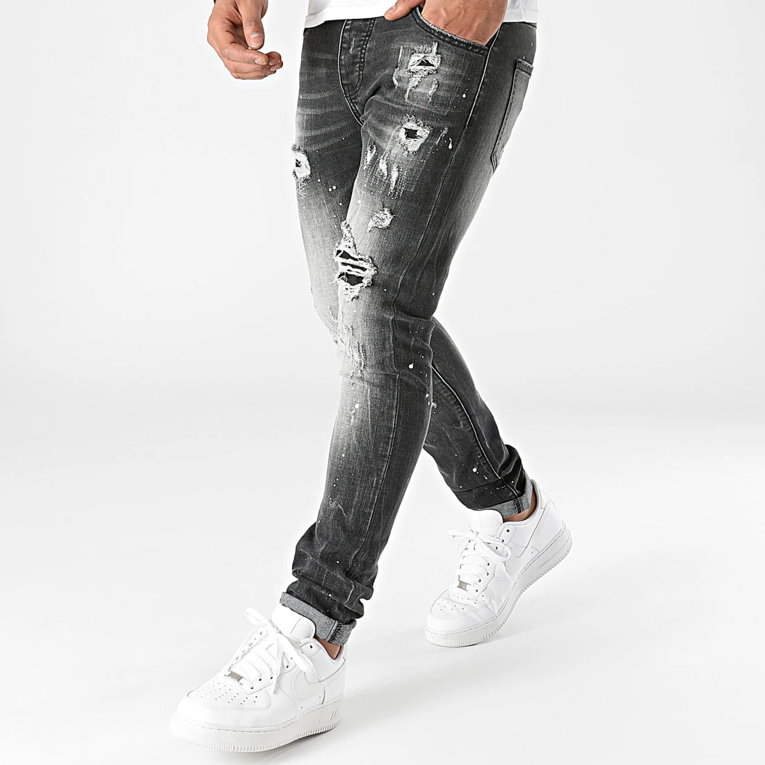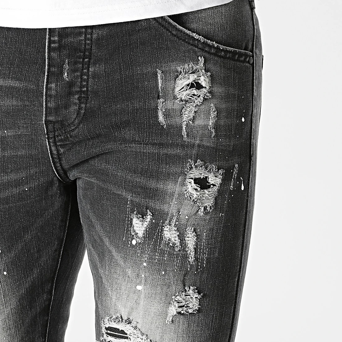 • Jean skinny finition tachée, usée et délavée avec rapiéçages