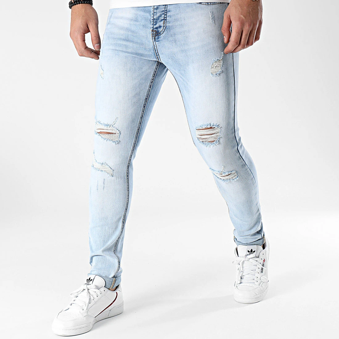 • Jean skinny en coton stretch finition usée et délavée avec trous apparents sur l’avant