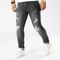 • Jean slim stretch finition délavée et usée avec trous apparents