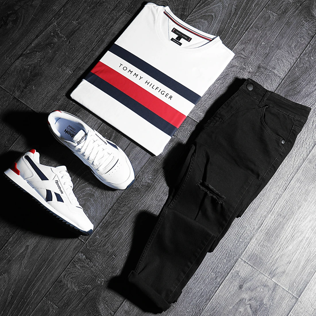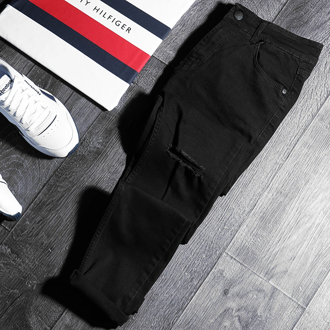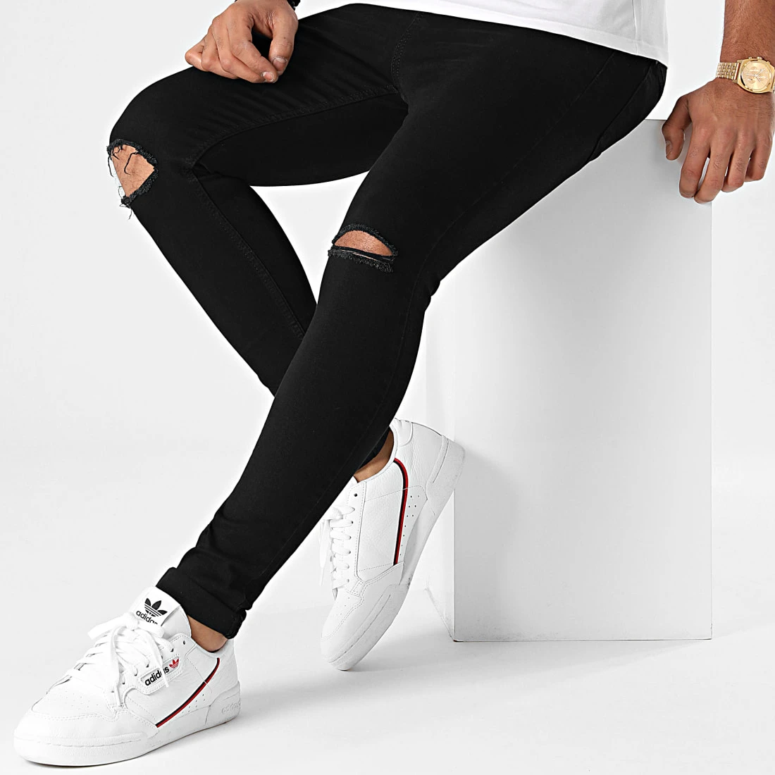 âąÂ Jean super skinny en coton stretch finition usĂ©e avec trous apparents sur les genoux