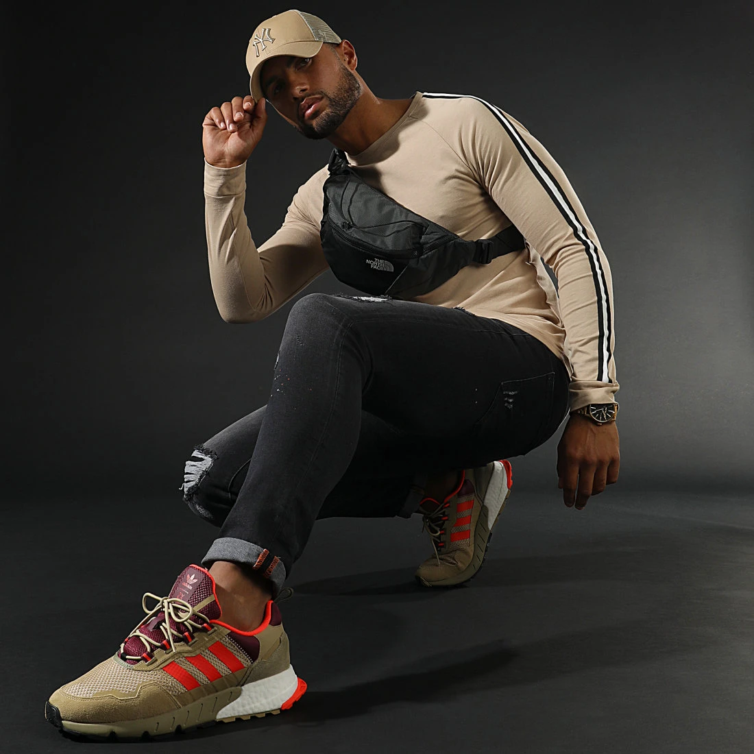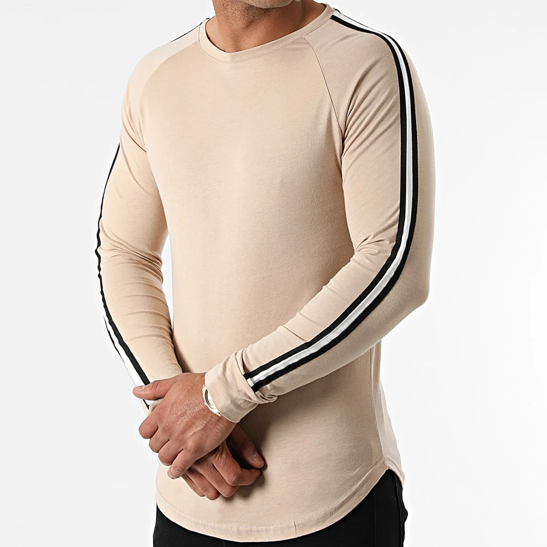 • T-shirt manches longues brodé bandes bicolore le long des manches