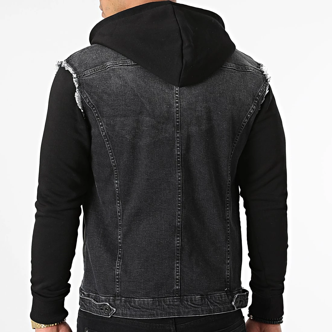 • Veste en jean bi-matière avec capuche amovible par boutons classiques