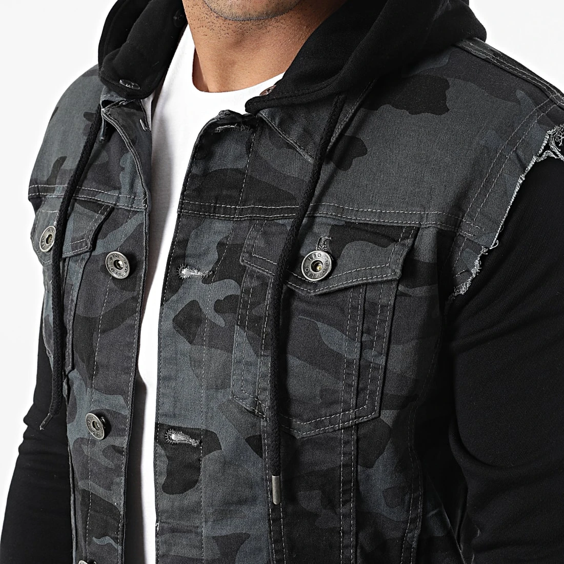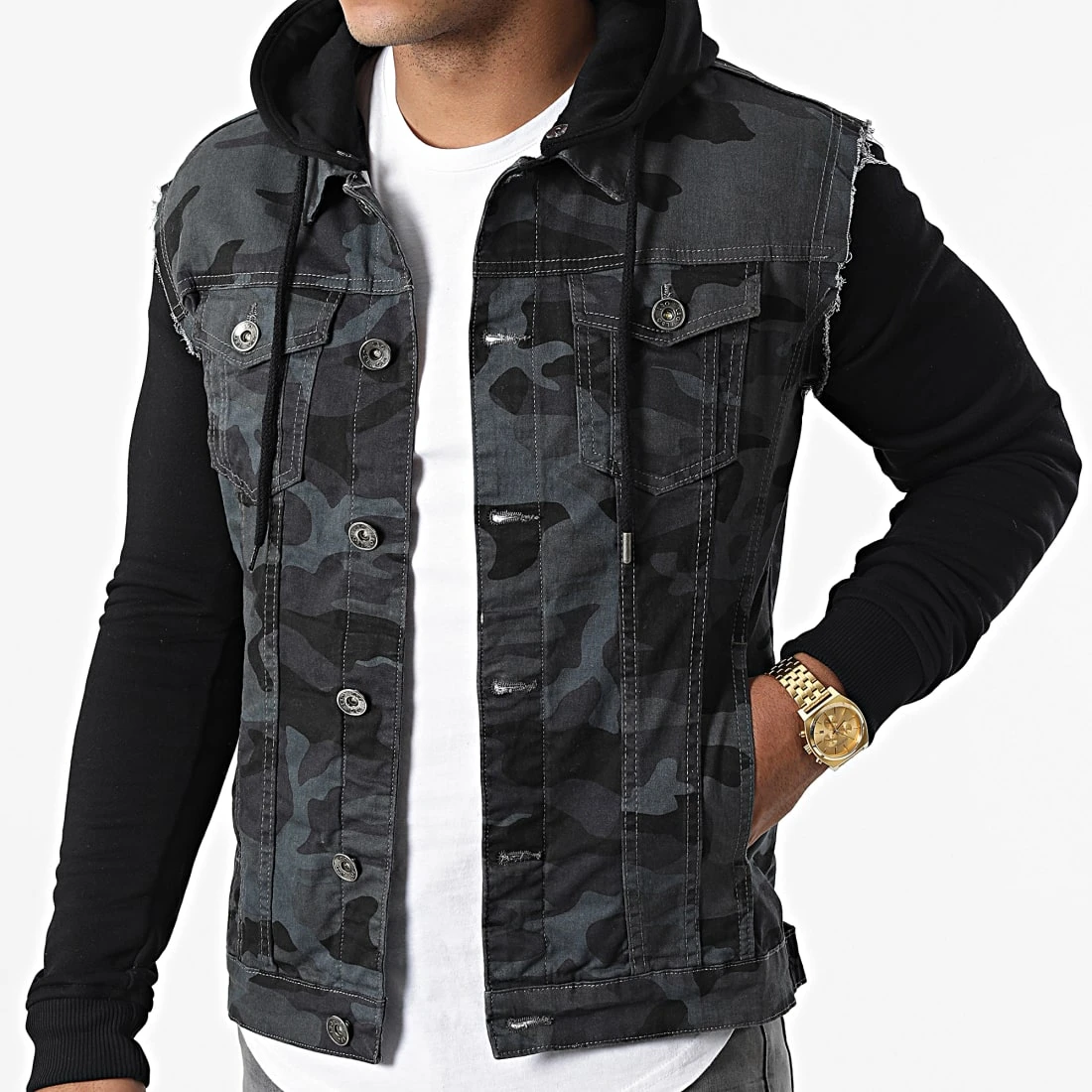 • Veste en jean à motif camouflage bi-matière avec capuche amovible via boutons classiques