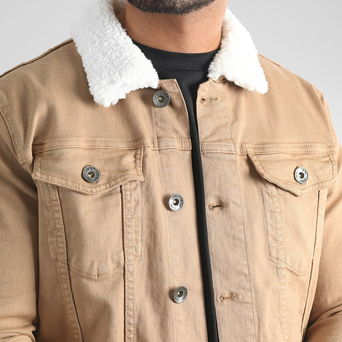 • Veste en jean en coton stretch avec col en fourrure synthetique mouton